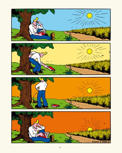 C’est l’un des grands plaisirs du festival international de la bande dessinée d’Angoulême : malgré la cohue et le froid, des rencontres fortes vous sauvent votre séjour dans la capitale charentaise. Cette année 2018 c’est un entretien avec Herr Seele qui fût mon point d’orgue, une rencontre longue et enrichissante, débridée et cohérente, fantaisiste et exigeante, à l’image de l’artiste, peintre et dessinateur flamand également joueur de mandoline et qui exerce le beau métier d’accordeur de piano. Herr Seele & Kamagurka développent depuis une trentaine d’années le personnage de Cowboy Henk, absurde cowboy blond à banane qui évolue dans des bandes dessinées à l’humour féroce dont la filiation serait à chercher à la fois du côté des surréalistes mais aussi chez les premiers grands auteurs de bandes dessinées américaines (Segar, Outcault, Kurtzman et bien d’autres). Les éditions Frémok éditent depuis quelques temps les aventures de Cowboy Henk, quatre livres ont paru à ce jour : Cowboy Henk : l’humour vache, Histoire de la Belgique (pour tous), L’Art Actuel & Cowboy Henk et le gang des Offreurs de Chevaux.